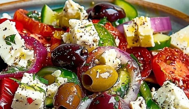 A delightful Greek salad celebrating fresh ingredients and wholesome flavors, perfect for nourishing body and soul.