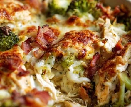 - In a large bowl, combine chicken, chopped bacon, blanched broccoli, minced garlic, ranch dressing, shredded mozzarella, and shredded cheddar cheese.