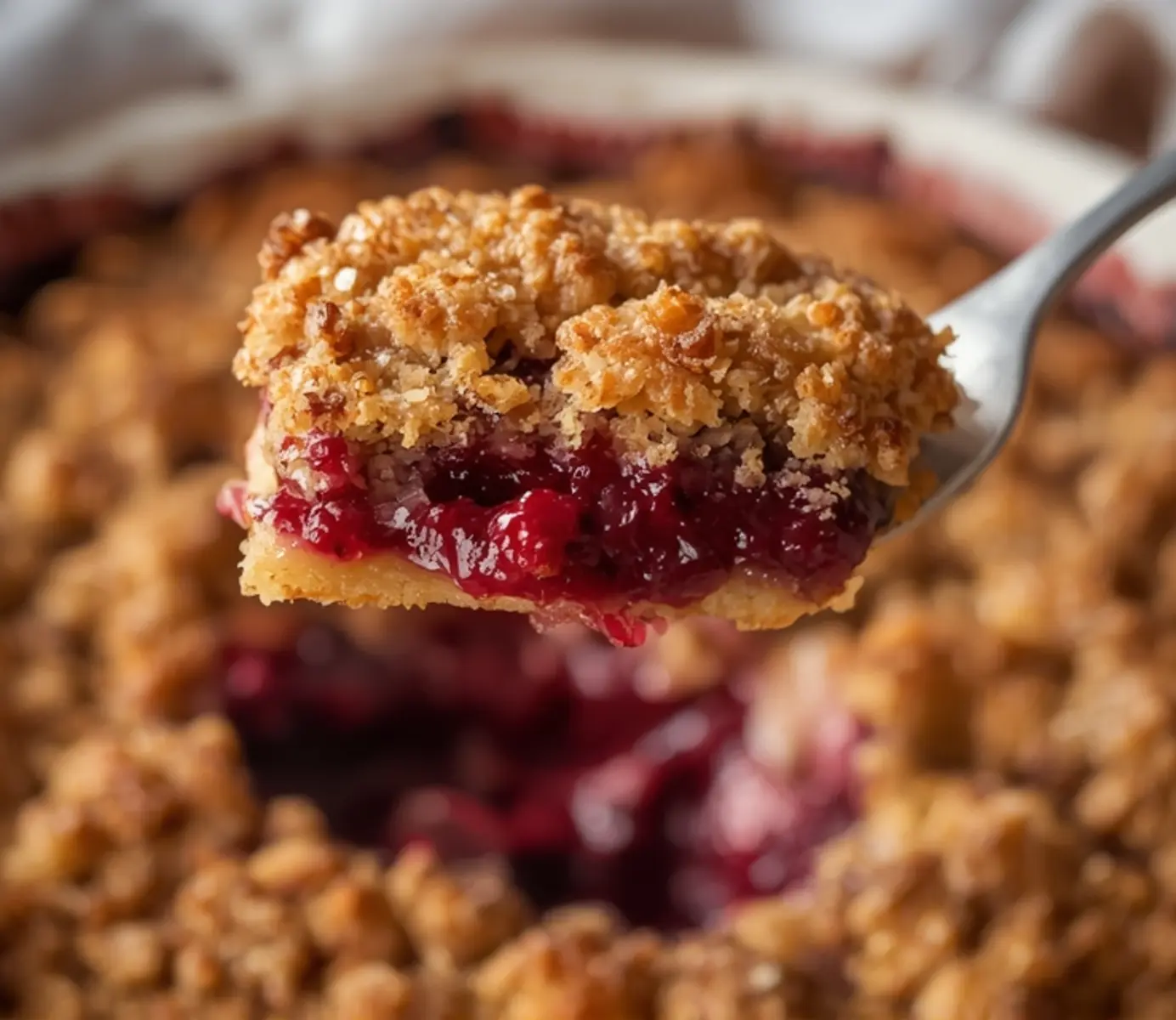 Reheat in a 300°F oven for 10 minutes to restore the crisp topping. A microwave works in a pinch but can make the crumble a bit softer. Let it rest a minute before serving to avoid a hot filling.