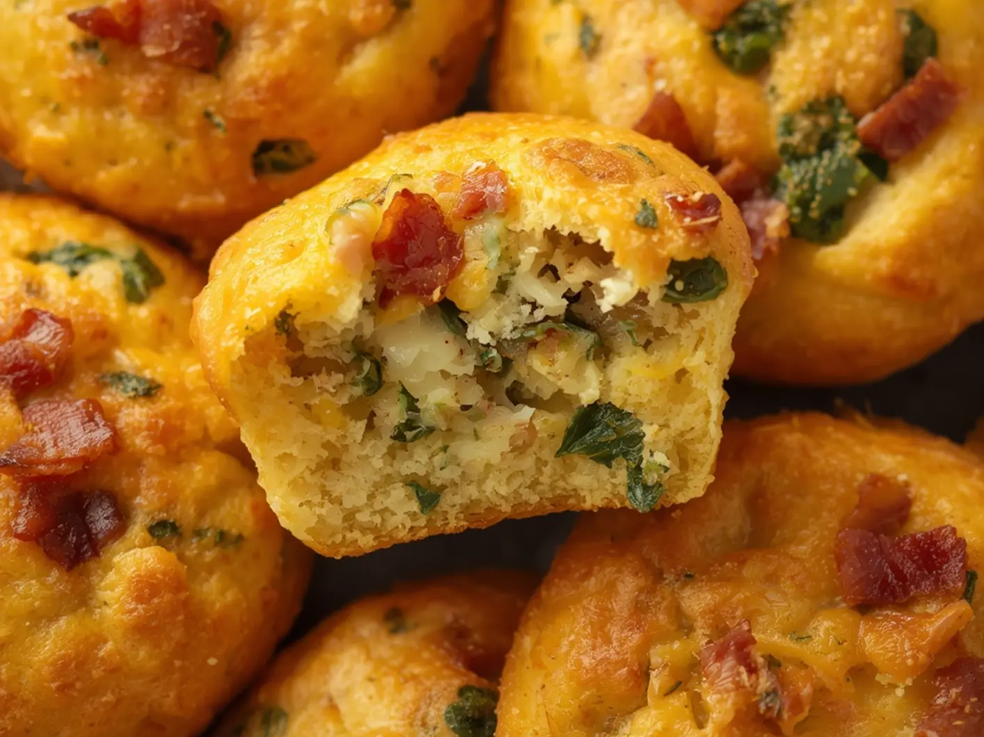 Stir in your chopped spinach, bacon, and cheese. I like to mix the cheese in the batter and sprinkle a little extra on top for that crispy edge. Pour the mixture evenly into the six muffin cups.
