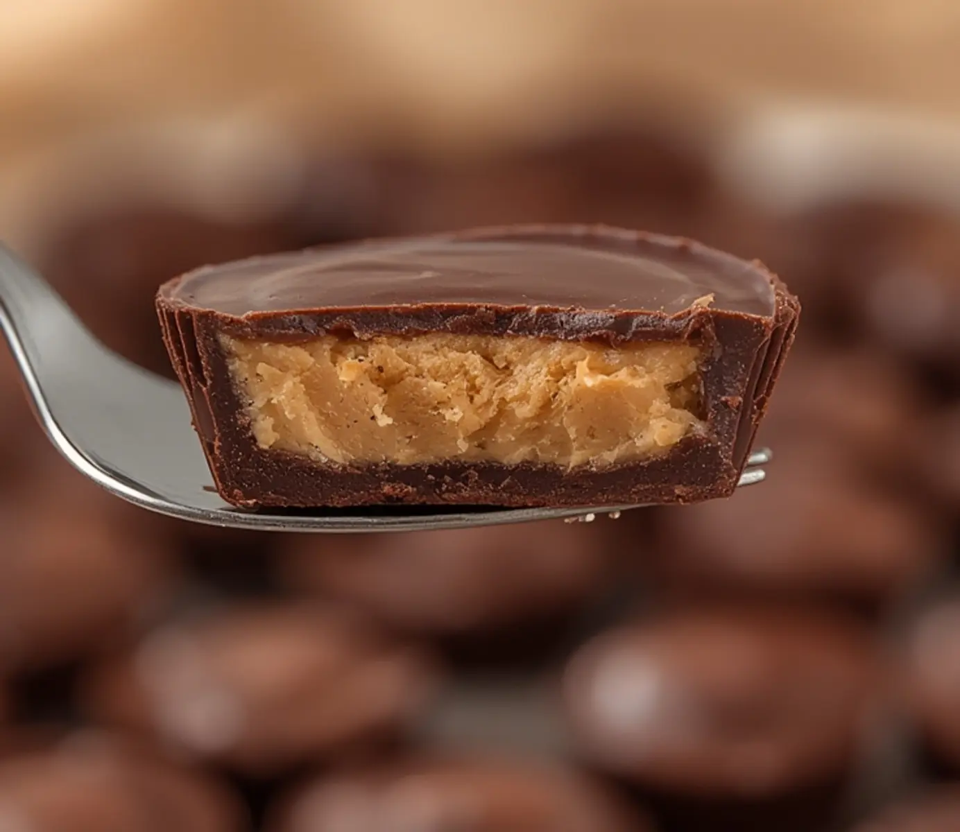 - Spoon a small layer of melted chocolate into each liner, then add a teaspoon of peanut butter mixture.