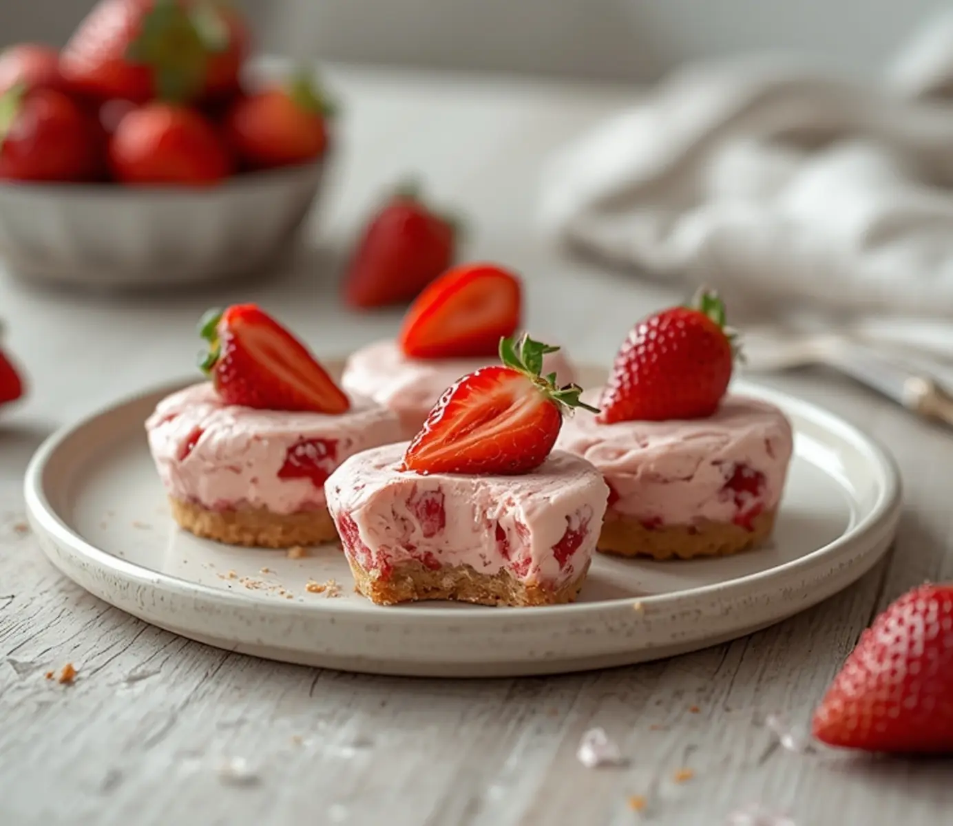 Keto Strawberry Cheesecake Bites: Creamy Keto Strawberry Cheesecake Bites with fresh strawberry toppings on a chilled plate, perfect for low-carb desserts.