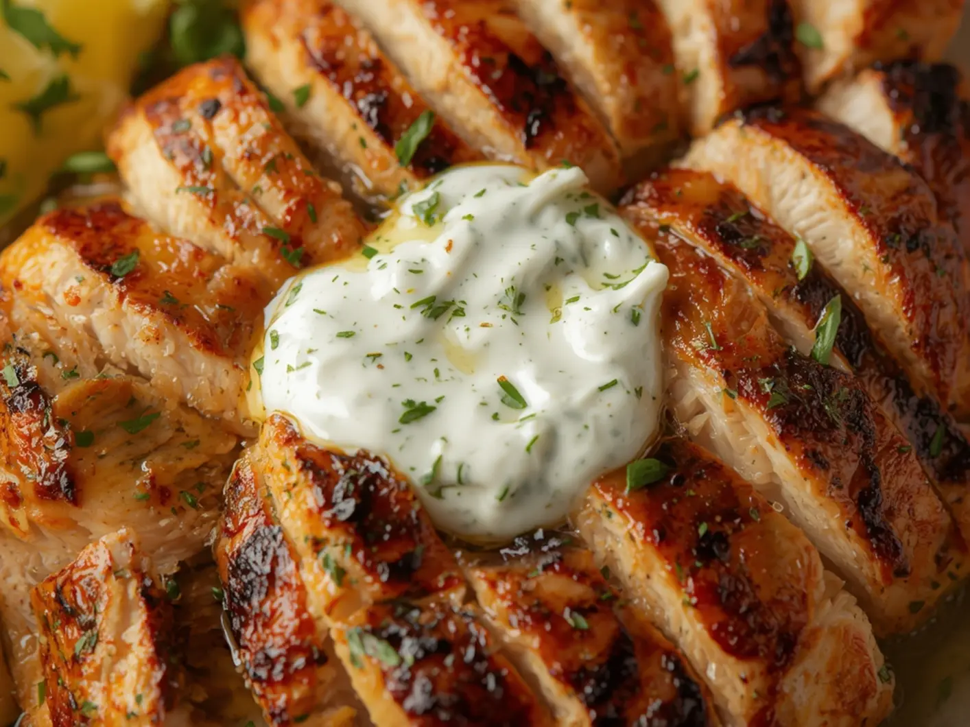 Lemon Herb Grilled Chicken with Tzatziki: Grilled chicken breast slices topped with creamy cucumber tzatziki sauce on a platter, showcasing golden char marks and fresh herbs.