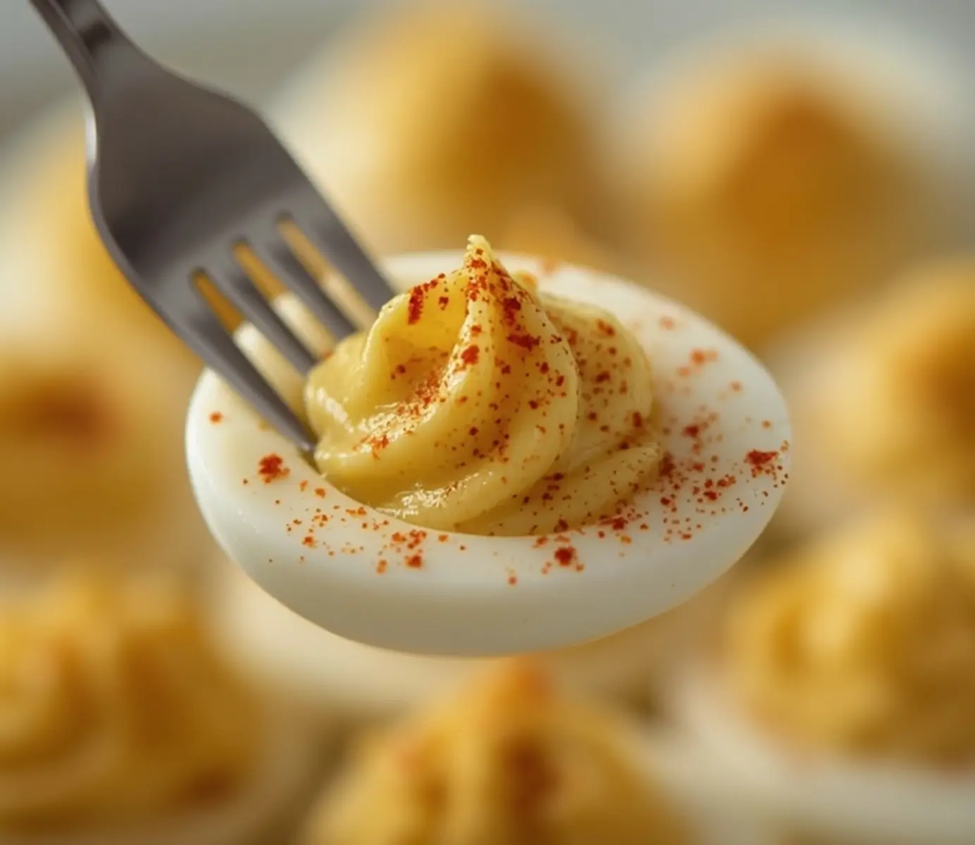 Mash the yolks with your chosen creamy base, a pinch of sea salt, and a dash of mustard. Blend until smooth and velvety. Spoon the mixture into a piping bag or Ziploc corner and gently fill the egg white halves. Garnish with paprika or herbs and serve immediately.