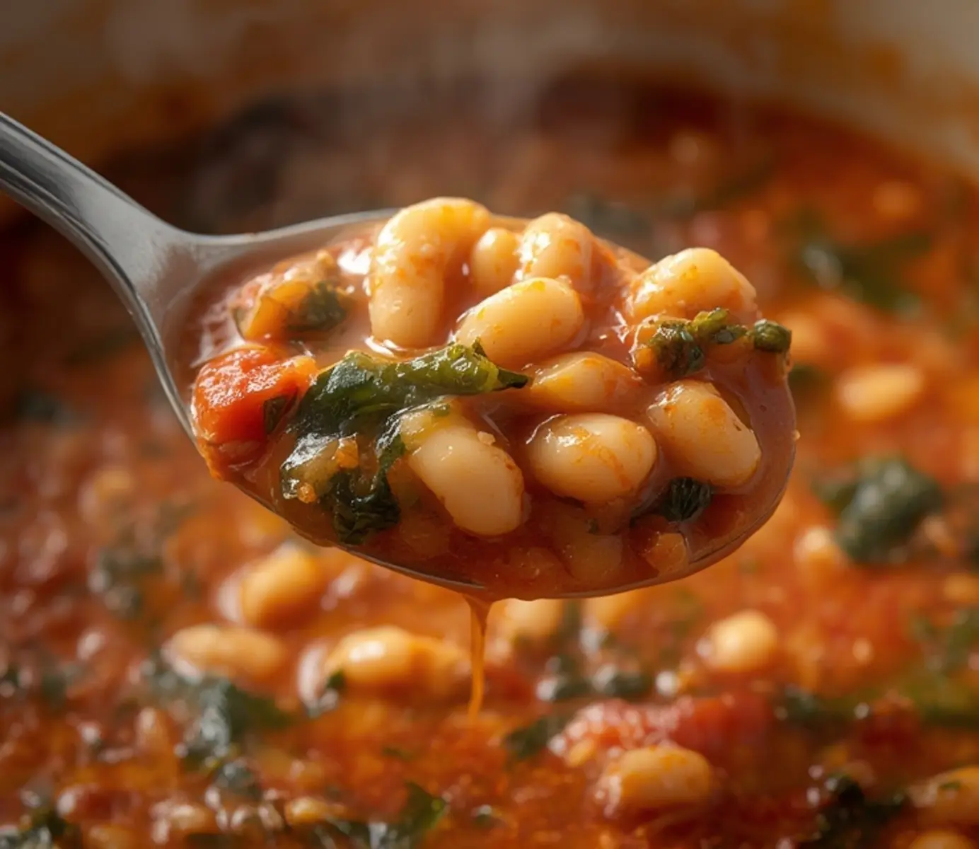 Mediterranean Bean Stew: Hearty Mediterranean Bean Stew simmering in a pot with white beans and spinach