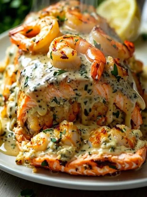 A delightful dish featuring rich salmon fillets stuffed with a creamy shrimp mixture, perfect for a nutritious and visually appealing dinner.