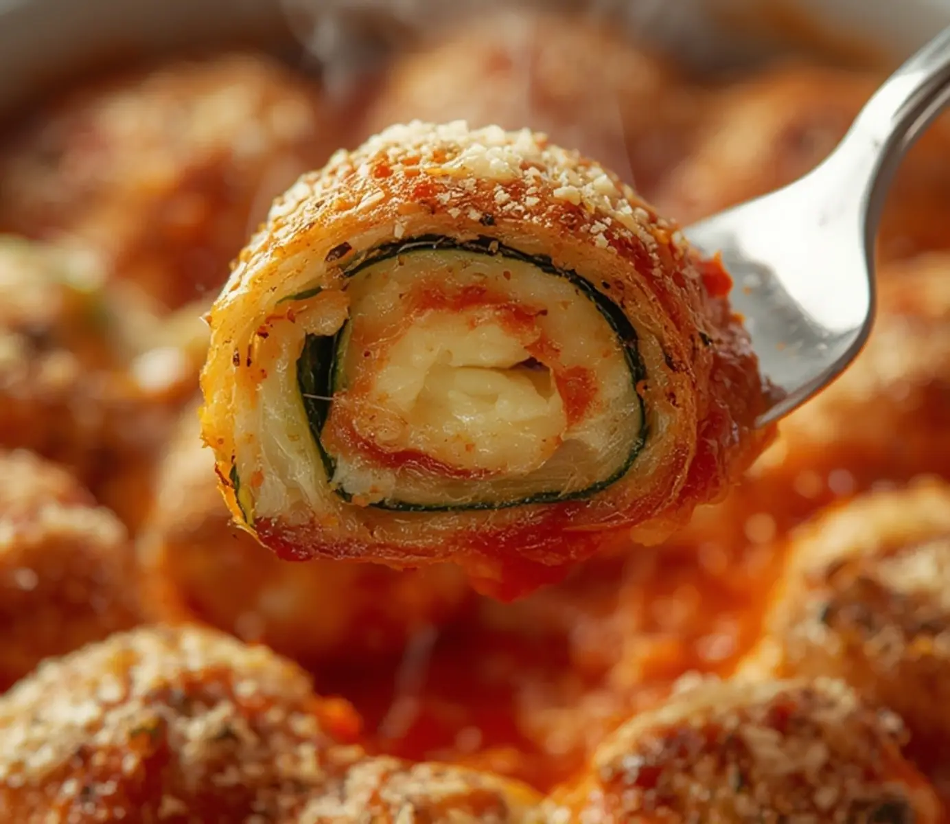 Zucchini Lasagna Rolls: Juicy baked zucchini lasagna rolls with melted cheese and marinara sauce in a skillet.